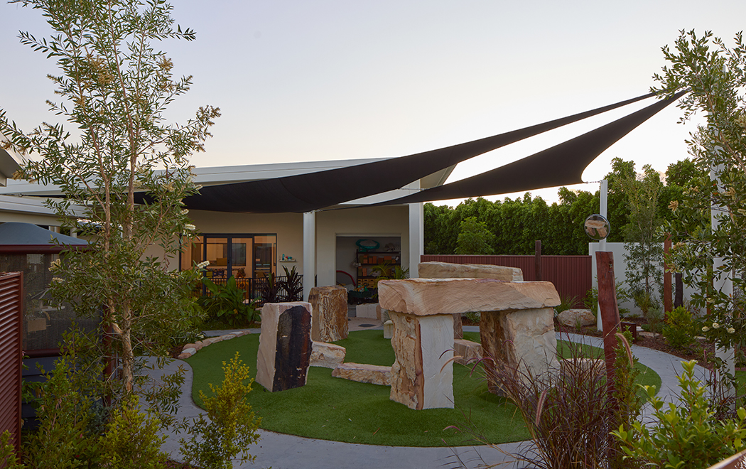 Large sections of the roof were optimised for solar panels, producing enough energy that air-conditioning is only used nominally. The sunshade and verandah space also help to defer heat transfer into the main structure. The internal courtyard and open spaces required a substantial sunshade to protect the children and reduce heat gain. When the original design was conceived in concrete, attaching shade sails to the main building was a relatively simple engineering concept.