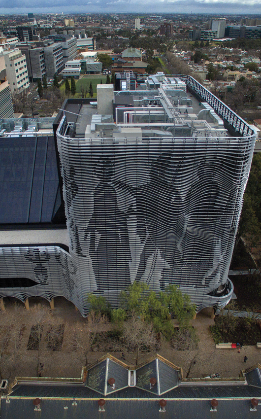 In this case, what that outer skin needed to do was function-shading for what is essentially a large glass building, via a form that reflected the substance and contribution of the scholarship that was occurring within the Faculty of the Arts. The representative figures and images from the Faculty’s collection that were chosen by the University for embossing on the facade in a giant scale included a 19th-century bronze sculpture, an ancient Greek vase and a painting by 19th-century Indigenous artist, Tommy McRae.