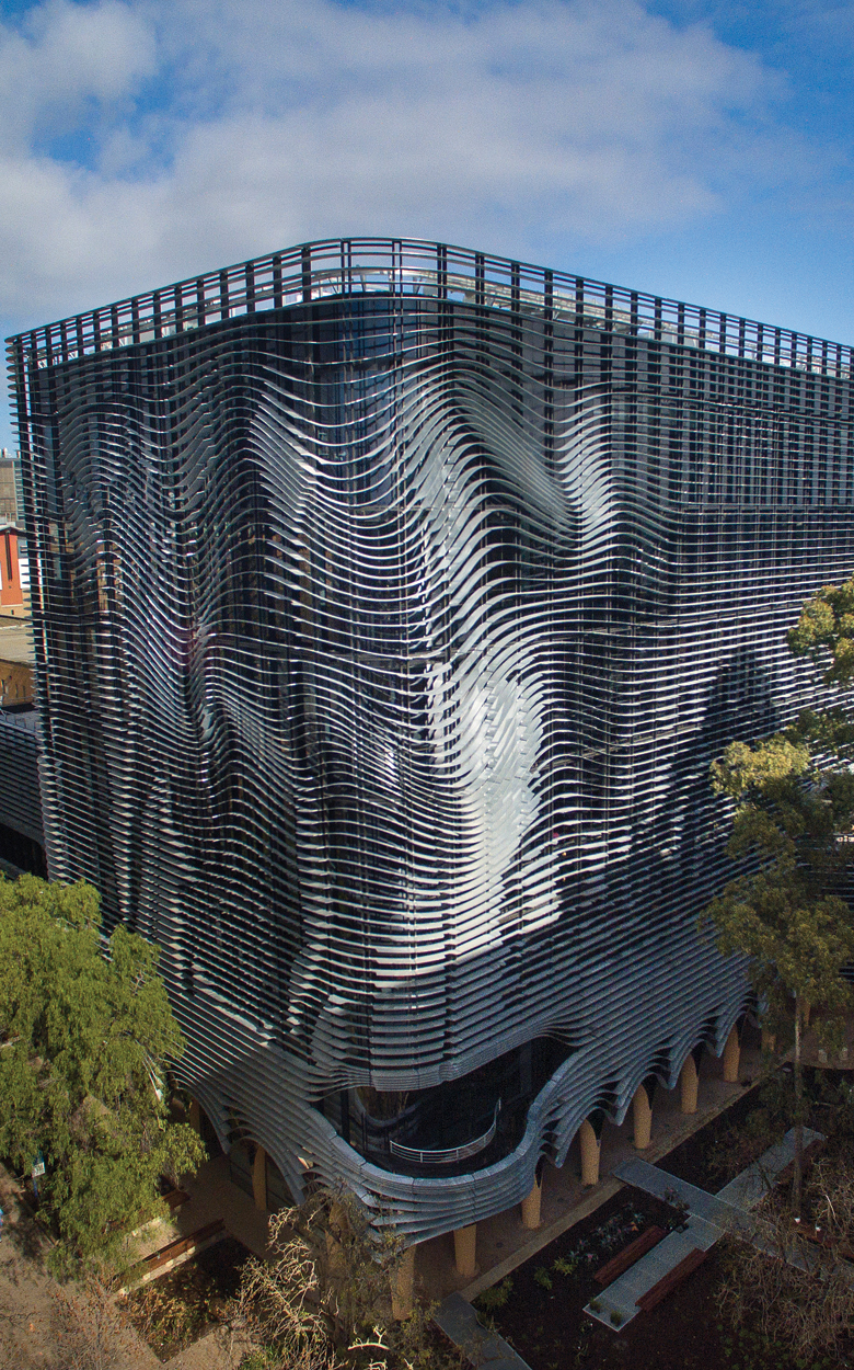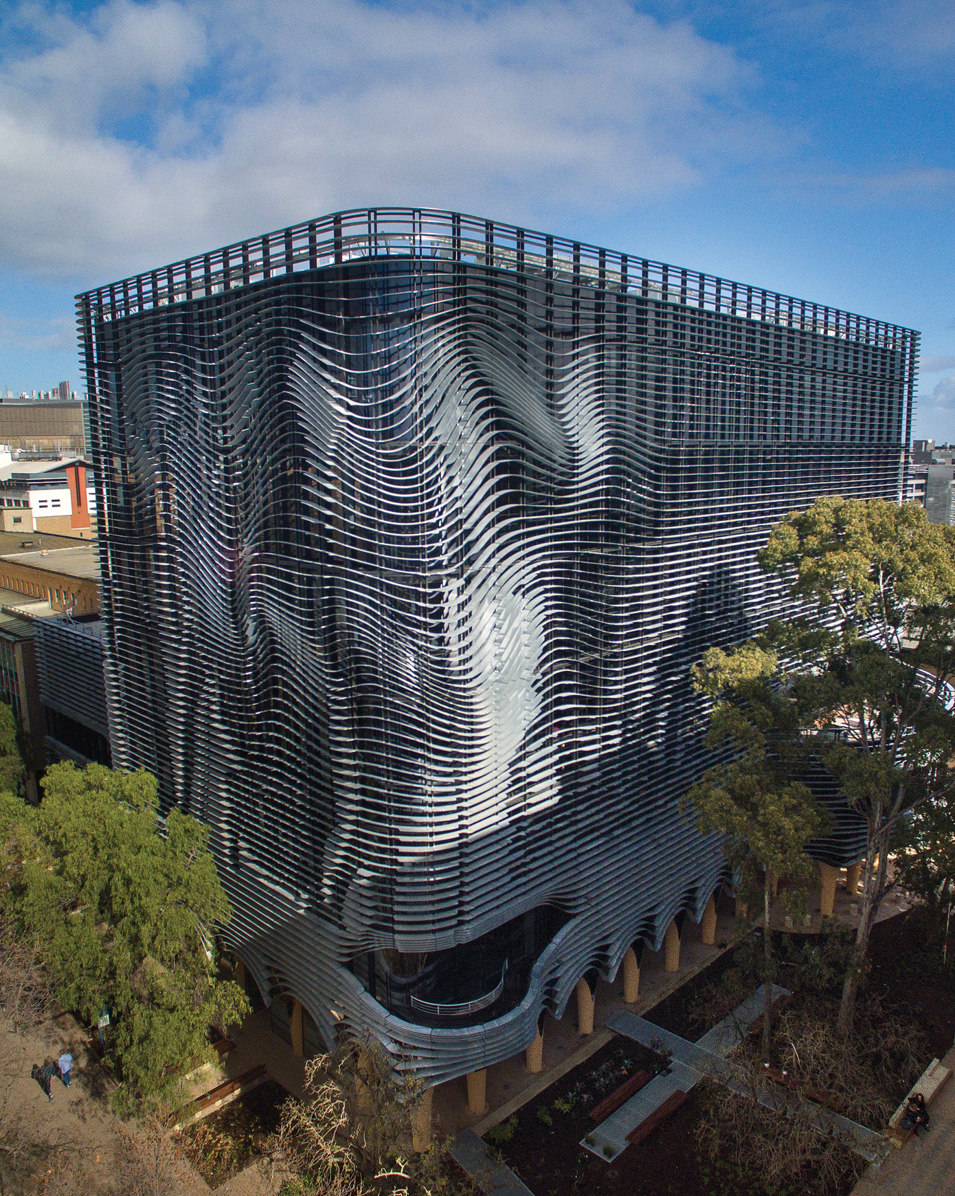 This story about Arts West, the University of Melbourne's Faculty of Arts building, is a story about collections – we've got time for three, here. Let's start with the building's signature steel fins: four-and-a-half-thousand of them, in fact, all made from 8mm XLERPLATE® steel (250 grade) and the vast majority of them individually unique.