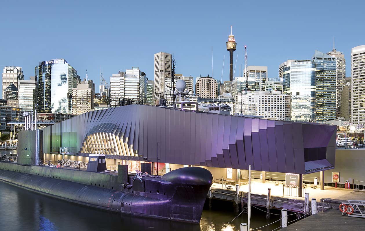 Built to mark the centenary of World War I and commemorate 100 years of Royal Australian Navy service, the Australian National Maritime Museum’s new Waterfront Pavilion occupies a narrow wharf between a navy destroyer and a submarine.