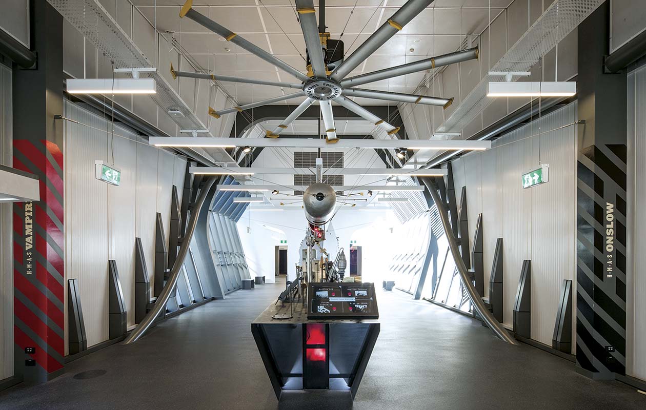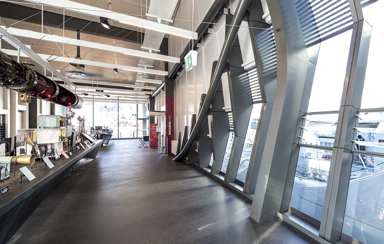 Preliminary discussions led to a design premise that ensured the building could occupy its place and respect the main maritime building, but more than anything it had to respond to the vessels. It’s ironic, then, that two such clinically engineered and man-made entities are the controls to such an organic shape, a stretched pipe rhythmically punctuated by vertically ridged segments. The form distorts at its middle, physically submitting in shape to the conning tower of the submarine and the bridge of the destroyer. This deferential nod to the sea craft produces a dynamic and elegant structure from every angle and distance.