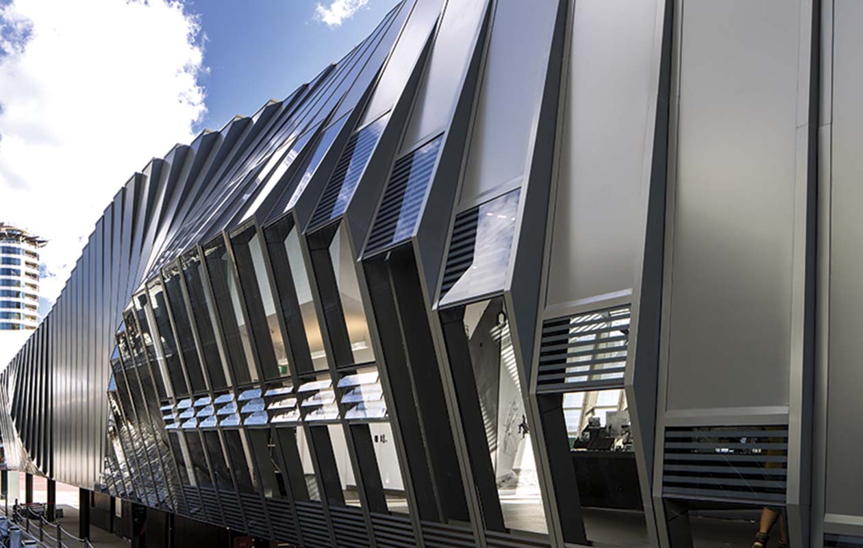 Taking its design cues from those vessels, and mindful of their propensity to move with the current and tide, the new building’s distinctive appearance results from rhythmically offsetting composite panels made from COLORBOND® Ultra steel in the colour Woodland Grey® to create a twisted carapace.