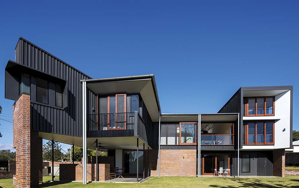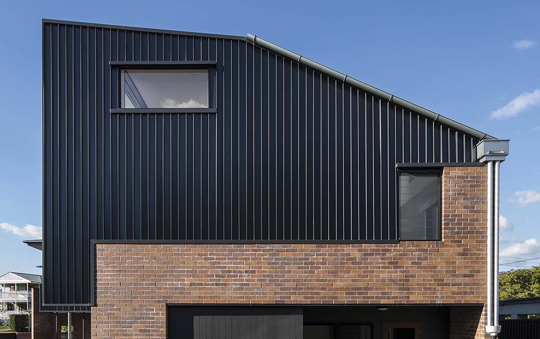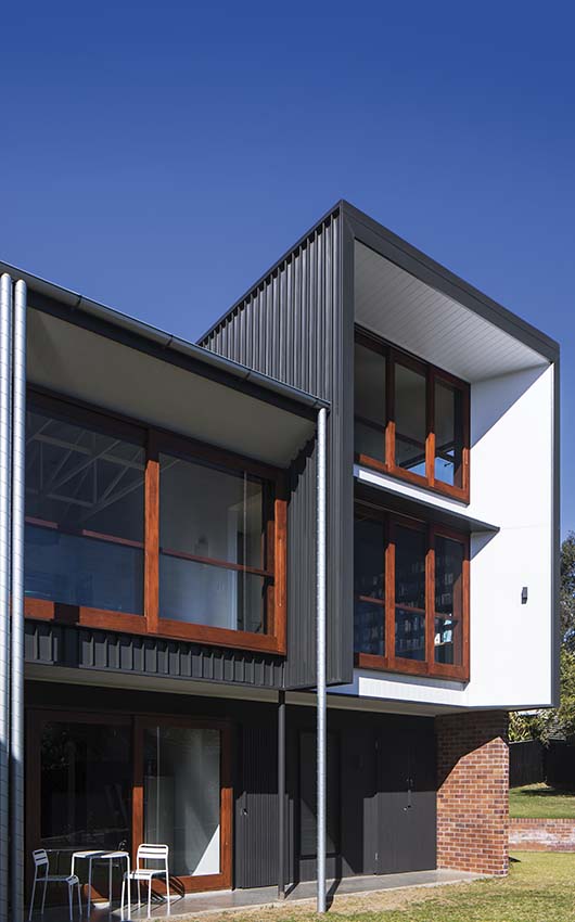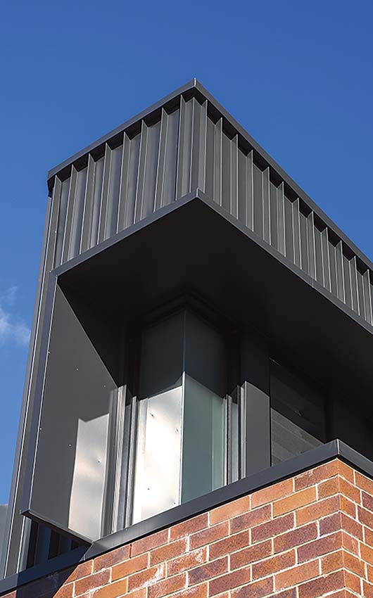 The act of wrapping is emphasised by the device of the steel elements being inserted into and over the brick walls, so that the metal appears as cut-out, applied as sections to the masonry core. The precision of the “cut-outs” is celebrated in the machined exactitude of the expressed, custom-made L-bracket window awnings, the balustrades and the architectural steel cladding, as well as the expressed custom-made rainwater heads. Flashings are also made from COLORBOND® steel in the colour Monument® while eave gutters and downpipes are made from ZINCALUME® steel. A nice rhythm is established where the metal elements peel away from and frame the brick walls and fenestrations in a jigsaw of varied shapes.