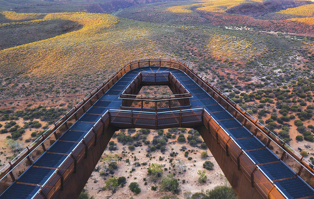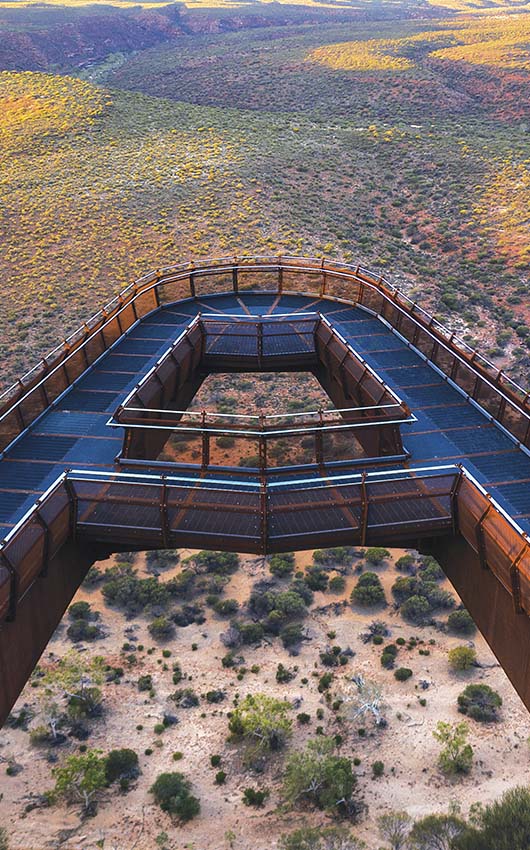 Overlooking the impressive Murchison River Gorge near Kalbarri, two new steel skywalks enable visitors to completely immerse themselves in the ancient landscape.