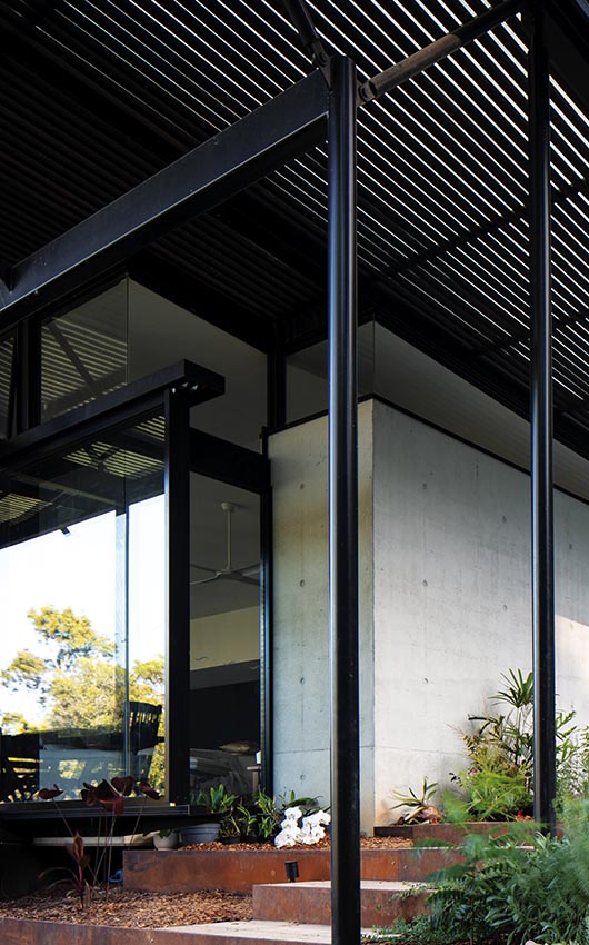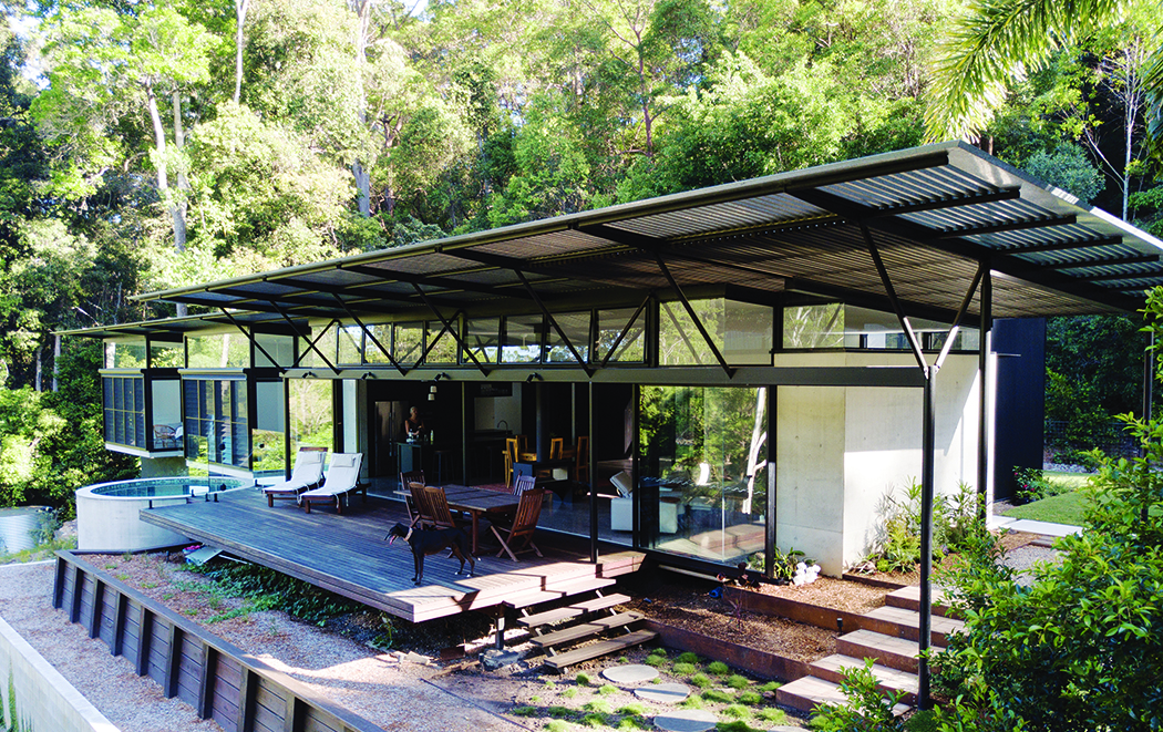 Meanwhile, the efficiency of steel as a building material achieves some similarly waste-reducing results. Savings made through prefabrication, transportability and erection speed bring costs and material waste down, as Robinson shares: “One of the things I really love about steel is that time spent in preparation is saved in assembly. With a 400-metre driveway dropping steeply, twisting and turning through the rainforest before rising again to the elevated house site, access was always going to be challenging. It was clear from the outset that getting trucks and materials to the building platform was going to be not only a consideration in material selection but an ongoing issue during construction.