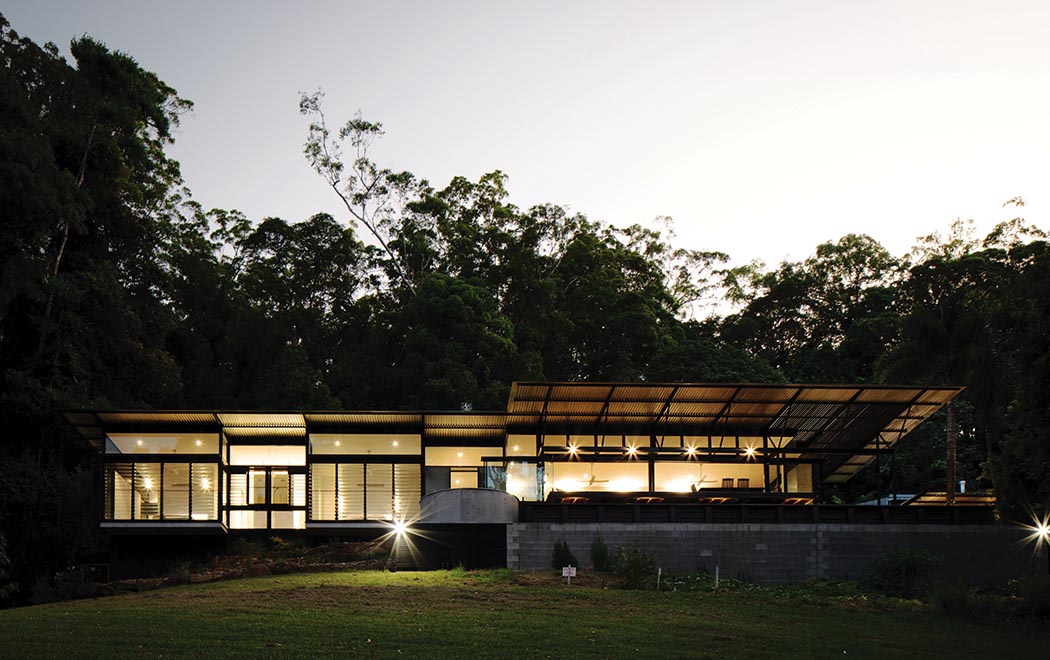Ridgewood House is set within 20 acres of lush and tranquil rainforest near Eumundi in the Noosa hinterland. With the property purchased by a couple seeking more sustainable living, the architects were highly cognisant of the need for design principles that championed self-sufficiency. These principles are realised through solar, rainwater and wastewater facilities at the house.