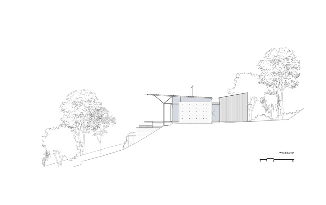 “Sustainability principles were applied to the architectural language of the project but there were also matters of material practicality. The steel frame was fabricated in a factory before being assembled onsite. The members were deliberately kept as lightweight as possible to reduce the spans and weight – evident in the fine struts that hold the large roof canopy up over the main living deck. This enabled smaller trucks to navigate the track,” Robinson continues.