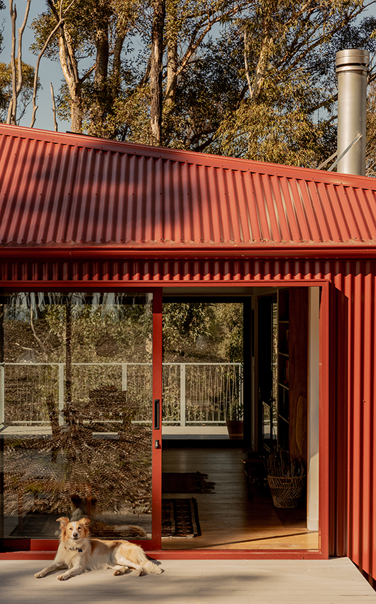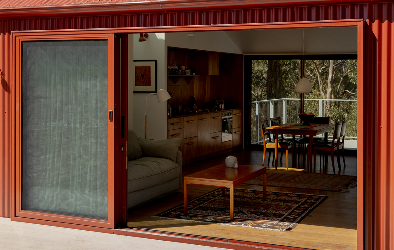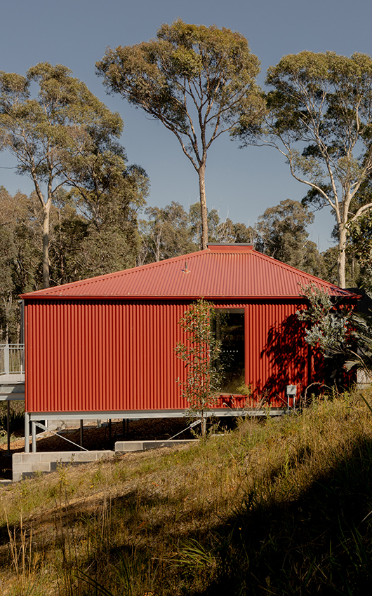 While many of the homes rebuilt in the area are project homes or larger houses that dominate the landscape, Scale’s design is altogether more singular. It references the modest, metal-clad fishing shacks dotted up and down the east coast; and while its LYSAGHT CUSTOM ORB ACCENT® cladding – made from COLORBOND® steel in the colour Manor Red® – is eye-catching, its rustic appearance and low-pitched roof seamlessly slot into the bush landscape. The humble size and simple design of Rosedale House sit comfortably among the tallowwoods and coastal blackbutts, but also helped the project to remain within the budget parameters.