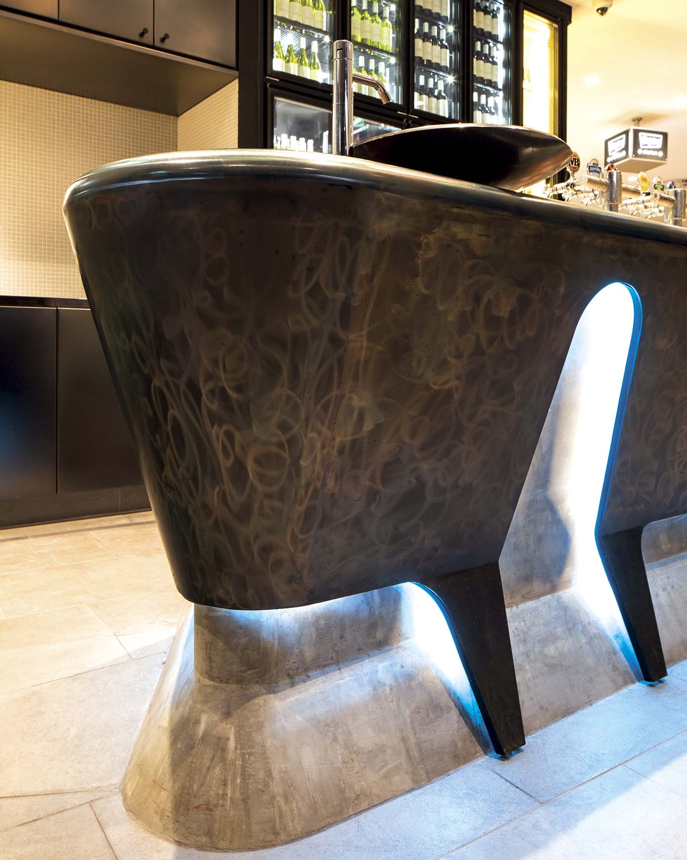 The bar’s 27 individual laser cut-outs are softly illuminated by concealed LEDs, furthering the intended impression of the steel oozing over its concrete base like so much melted chocolate.