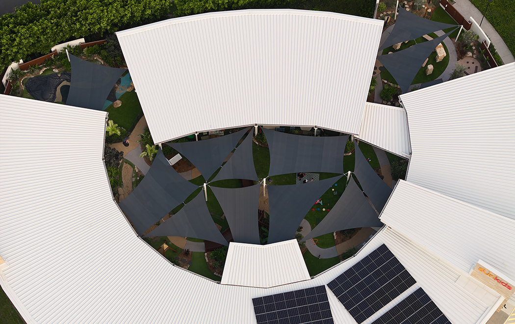 Large sections of the roof were optimised for solar panels, producing enough energy that air-conditioning is only used nominally. The sunshade and verandah space also help to defer heat transfer into the main structure. The internal courtyard and open spaces required a substantial sunshade to protect the children and reduce heat gain. When the original design was conceived in concrete, attaching shade sails to the main building was a relatively simple engineering concept.