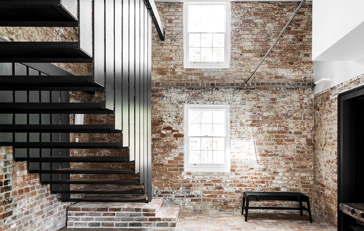 At the foot of the stairs in the gallery, bricks recycled from on-site demolition form an approach to the stairway, while the treads are timber salvaged from the previous, rotted, flooring.