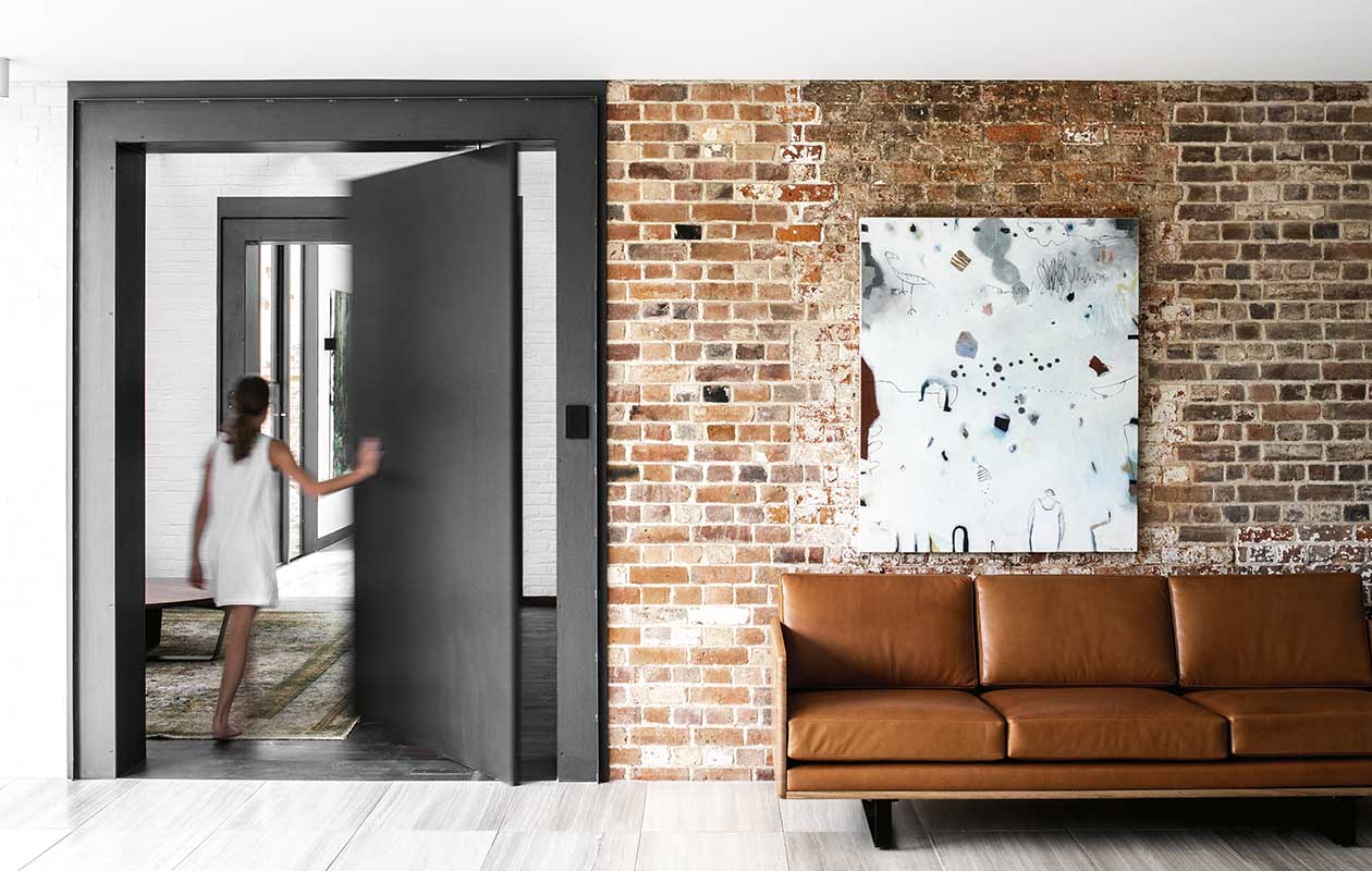 Interior thresholds, where new openings have been created, have a steel surround fabricated from RHS and Equal Angle (EA) – which signals that it is a new opening as opposed to an existing one. With the pivot doors, these surrounds act like reveals.