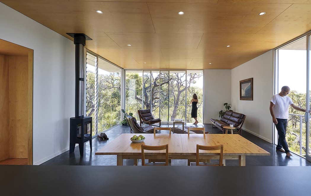 Low maintenance was part of the brief for this couple, who currently spend about one long weekend a month at their elevated steel house. “In future, when Ian retires, we’ll spend weeks or even months at a time down there,” Yvette says.