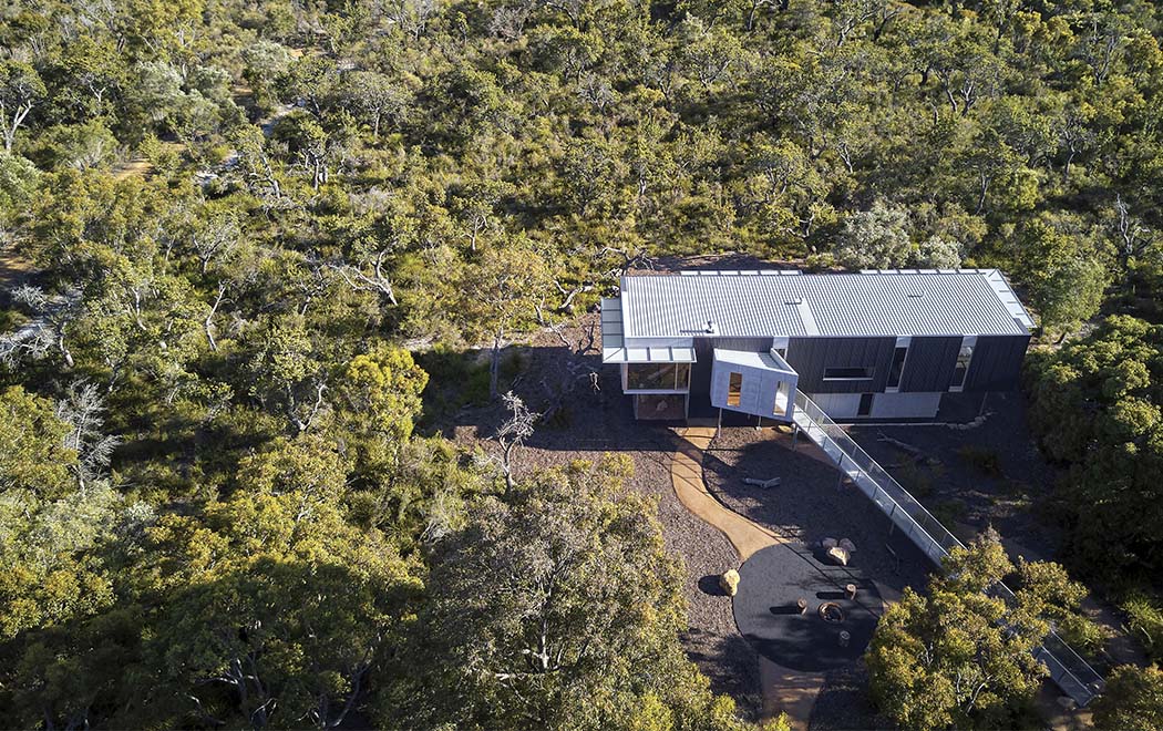 The house hovers amongst the tree-tops on slender steel columns that imbue a sense of lightness and maintain a lookout across the native landscape which is connected via judicious glazing. Contrasting its raw and pragmatic exterior is an interior defined by softer materials which provide a warm and inviting glow. Its long steel entry bridge variably accentuates the landscape conditions on approach, enticing further exploration within.
