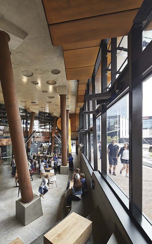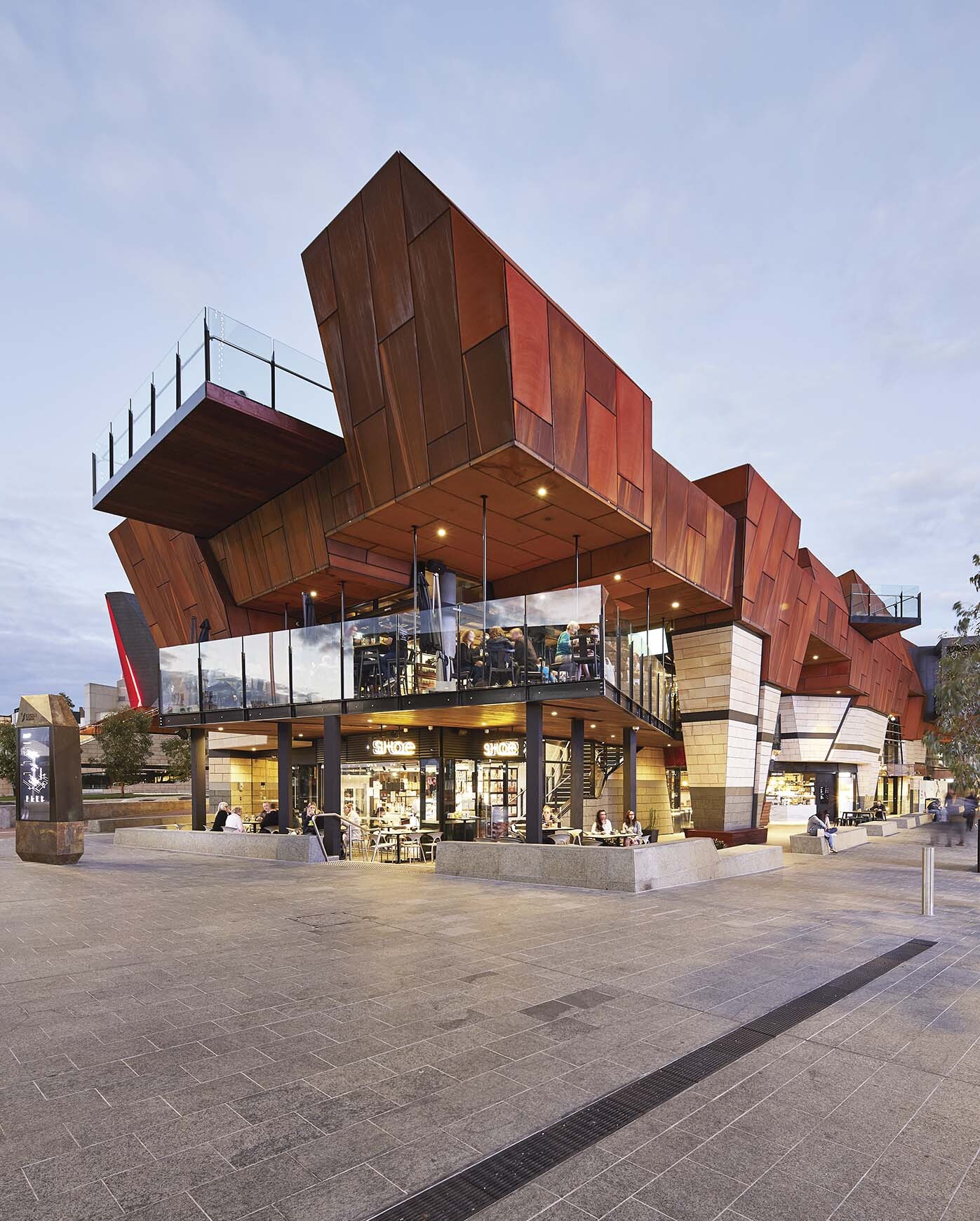 The architects used steel in the form of circular columns sleeved in 32 tonnes of oxidised raw steel, echoing the aged hue of the facade’s REDCOR® weathering steel. As a bustling food hall, its interior extends the exterior’s geological formations with a scheme that references a cave or mine. Polished concrete flooring adds to the robustness of the material palette, as does the concrete soffit, which is rock-like in appearance. Yagan Square’s welcoming accessibility and effortless flow belies the project’s architectural complexity and rigour. With many of the key features not able to be realised in a material other than steel, a materiality rich in texture and colour is integral to its successful outcome. The project itself functions as a vessel through which the themes of Country are compellingly narrated and as a built precinct, it is nothing short of diverse, fun and entertaining.