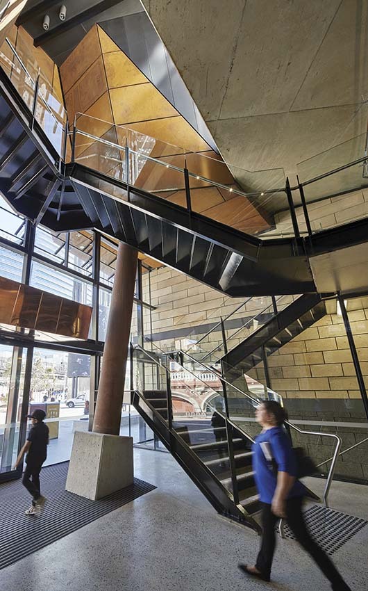 The gutters and downpipes were also covered with flat sheet made from COLORBOND® steel in the colour Monument® Matt, so they appear as a layer, or band, in the material stratum. “The REDCOR® weathering steel part of the facade also projects beyond the stone cladding below and emphasises the geological or tectonic nature of the building,” says Lyons’ Paul Dash. “From the perspective of the project’s design narrative, the gutters represent as cracks, or fissures, in the surface.”