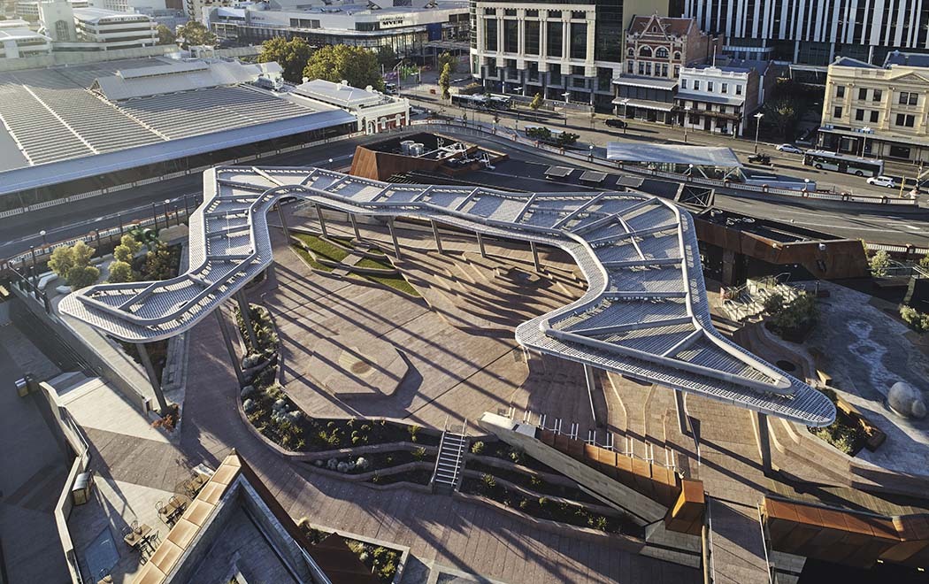 The use of steel as reinforcements in concrete and as supporting structural elements also enabled the landscape architects to incorporate deep soil zones, trees and sculpted stone in the upper levels’ design. BlueScope supplied the project with a whopping 335 tonnes of structure made from XLERPLATE® steel (450 grade). “Yagan Square’s materials were sourced locally from the south-west of Western Australia, which reduced transportation costs and emissions,” says Lyons’ Appleton. “Using steel that was sourced from local suppliers was vital to the overall design and its great strength-to-weight ratio means we used less material to achieve more.” Shade canopies are supported by steel columns and the digital tower itself made from 155 tonnes of XLERPLATE® steel (450 grade) at the project’s south-western entrance features 14 steel ‘reeds’ that represent the language groups of the Noongar Nation. This feature is a particularly eloquent manifestation of steel’s capabilities, with each reed rising thin and tall into the sky, cantilevering over 25 metres above the last lateral support. The tower’s verticality provides a nice counterpoint to the central elevated footbridge made from XLERPLATE® steel (450 grade) and REDCOR® weathering steel, which references the geology of the Darling Range Batholith that forms part of the Yilgran Craton.