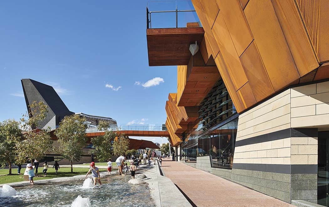 The roofing made from COLORBOND® steel in LYSAGHT KLIP-LOK 700 HI-STRENGTH® profile – a wide-cover concealed fixed cladding offering long spans and excellent uplift performance – and Stramit Longspan® – a profile offering excellent strength and water-carrying capacity and weather-tightness allowing very low roof pitches – also made from COLORBOND® steel, both in the colour Monument®, offer contrast and also complemented the project’s landscaping. “Steel provided the structure that allowed us to design amazing urban landscape experiences on top of the buildings,” explains ASPECT Studios’ director Kirsten Bauer. “It made a play space and water play area three storeys up in the middle of the city possible. You need excellent structure to achieve those types of outcomes and without steel neither of these elements would exist.” Certainly, the landscaping is key to Yagan Square’s success as a public space. It not only defines the programme and expresses narrative at every turn – for example, the children’s play area represents rock formations of regional Western Australia – but genuinely stirs real engagement, interaction and curiosity.